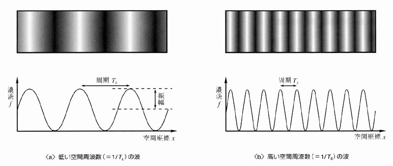 それに対して空間周波数領域は,単位長さ(たとえば1mm)中に存在する明暗の縞模様で表される波の数を意味し,同様に波の周期の逆数で定義される.