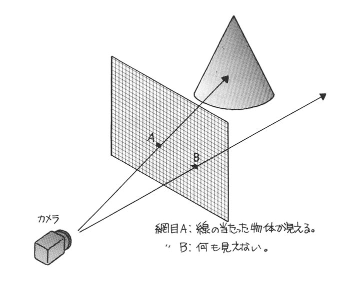 網戸の格子をモニター上の1画素と考え,そしてその先にコンピュータ内部で構築された3次元物体があると考えれば良い.