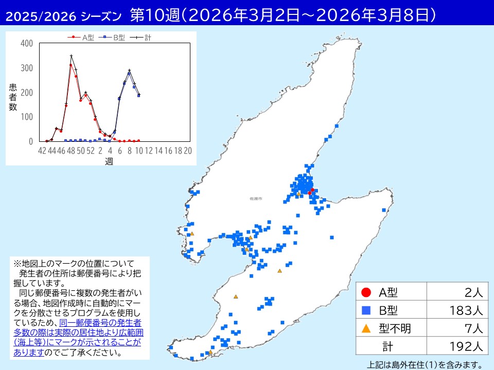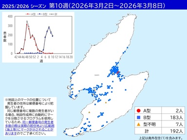 - 第10週は 192例(A型 2例、B型 183例、型不明 7例)の発症登録がありました。前週より減少しています。