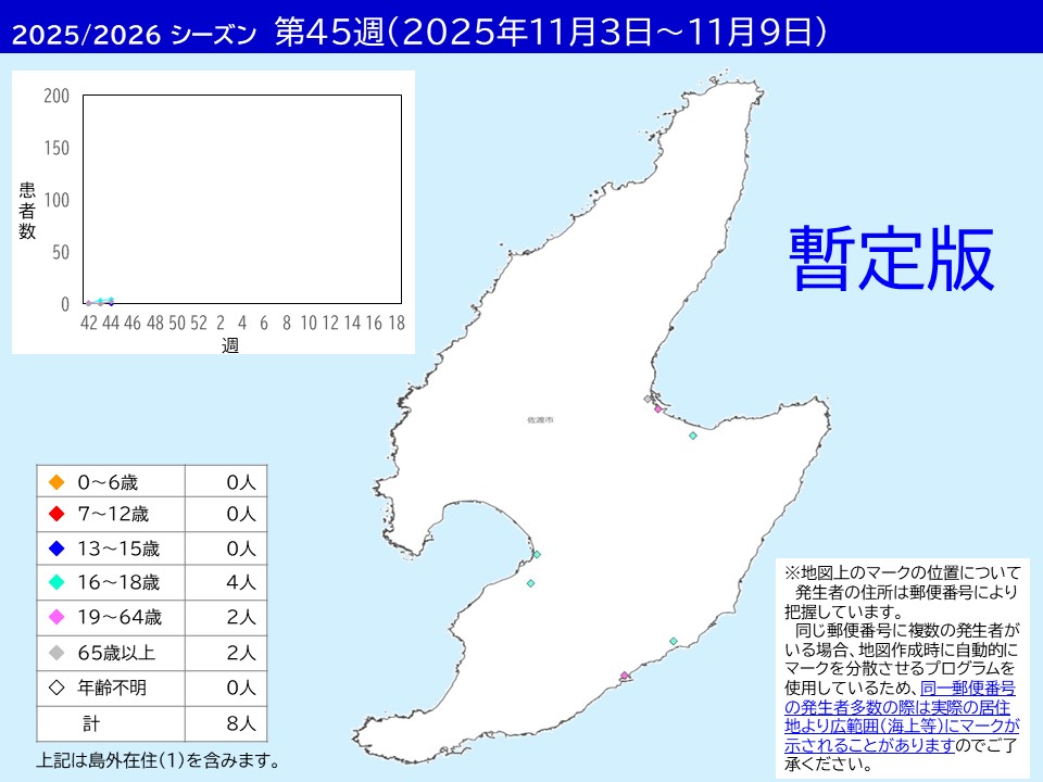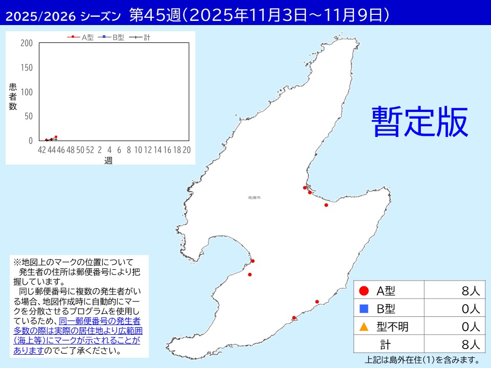 - 第45週は 8例(A型 8例、B型 0例、型不明 0例)の発症登録がありました。前週より増加しています。