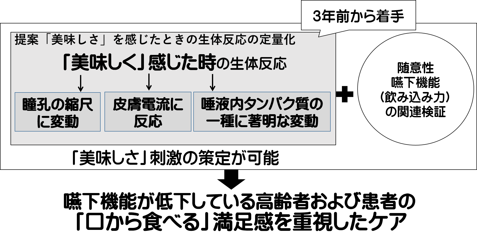 それは「瞳孔の縮尺」・「皮膚電気反応」および「唾液内タンパク質の特異的変動」です。これらの検証のもと、「美味しさ」刺激となるサンプルを策定し、随意性嚥下機能の定量化を行っていきたいと思います。