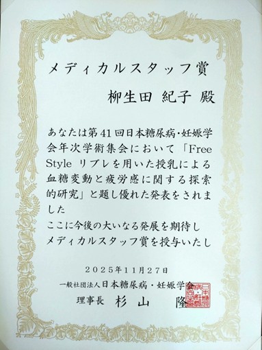 | 2025.12.02 | 看護学専攻柳生田助教らが日本糖尿病・妊娠学会年次学術集会でメディカルスタッフ賞を受賞しました |