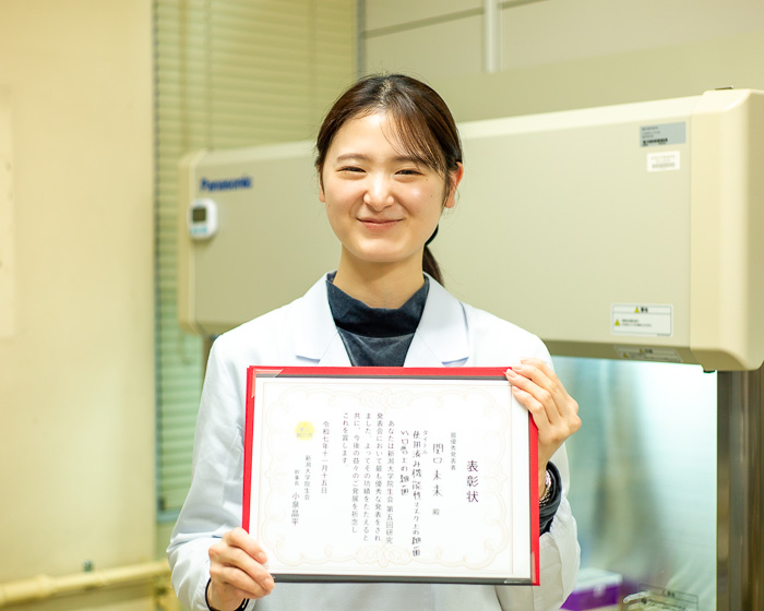 博士前期課程2年の関口未来さん(検査技術科学分野)が、五十嵐キャンパス(新潟大学OMNライブラリーホール)で開催された新潟大学・院生会第5回研究発表会(2025年11月15日開催)において、最優秀賞を受賞しました。