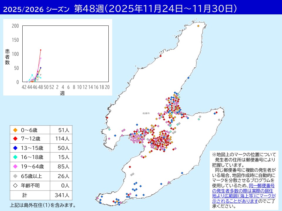 ・第48週に171例の追加登録がありました(未着分が到着したため)ので、発生地図及び佐渡市内発生状況の説明文を更新しました(12月5日)。