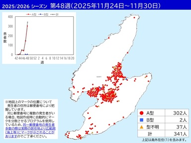 - 第48週は 341例(A型 302例、B型 2例、型不明 37例)の発症登録がありました。前週に比べ倍増しました。