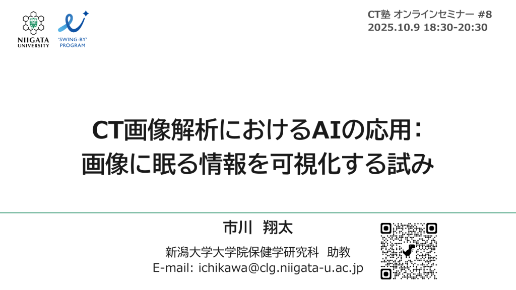 2025年10月13日 / Last updated : 2025年10月13日 sichikawa@A120 お知らせ 第8回 CT塾オンラインセミナーに登壇しました. 2025年10月9日(木)19:40〜20:30第8回 CT塾オンラインセミナー「CT検査のAIの現在と可能性」にて、「CT画像解析におけるAIの応用:画像に眠る情報を可視化する試み」をテーマに講演を行いました.